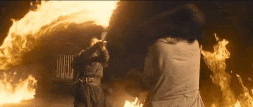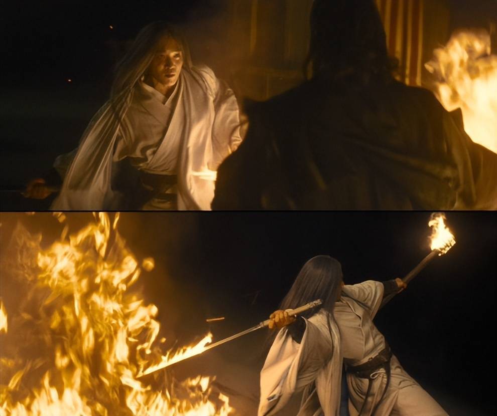 为了这场戏,剧组远赴新疆大漠铺设油线,使用汽油与煤油混合燃料模拟火油效果,这种真实火焰带来的灼热感,远不是CG特效能比拟的。