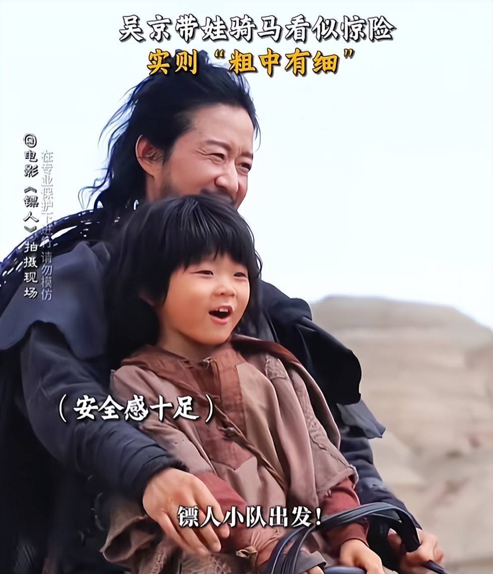 为了安全,吴京在带着孩子骑马时,总会自己先试着跑一圈,确认过后再将小孩带上来,用安全带和自己绑在一起。